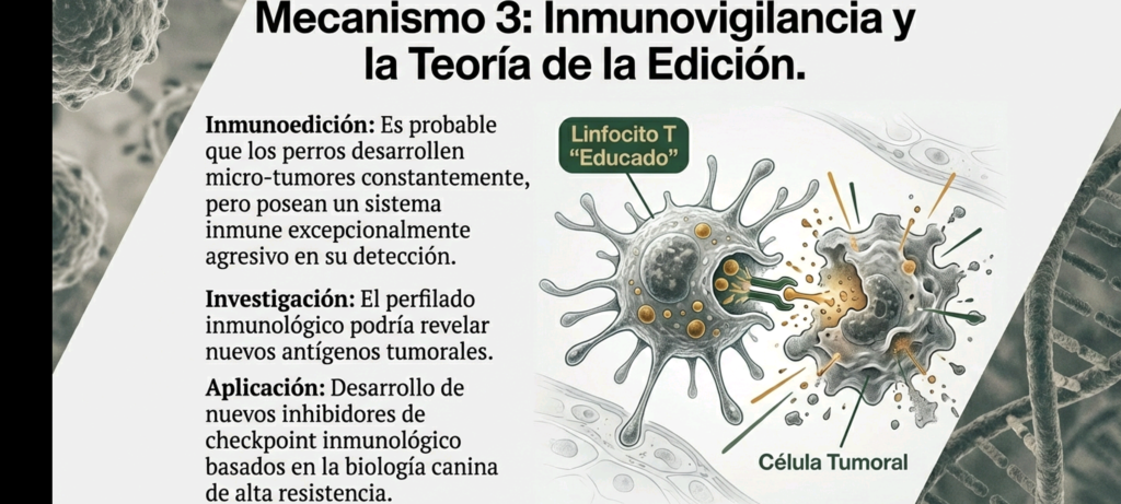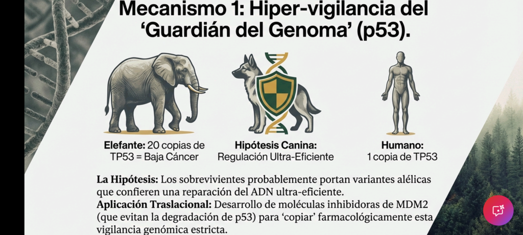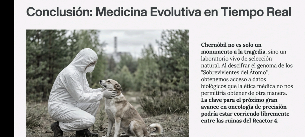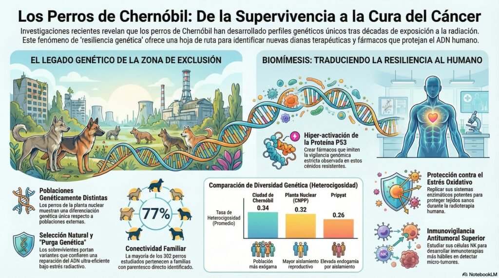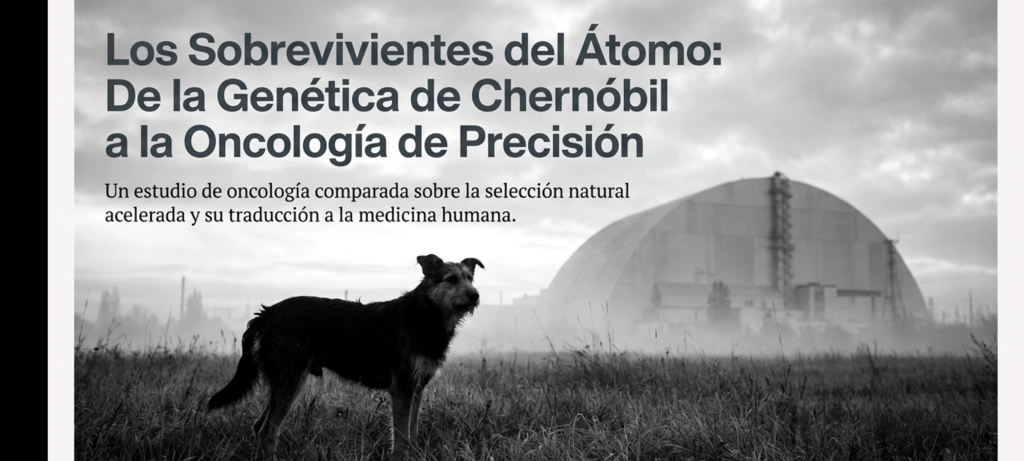 4. Potencial Traslacional: Del Perro de Chernóbil a la Oncología HumanaLa observación de estos perros permite pasar de la demografía a la biomímesis molecular. Se plantean tres mecanismos biológicos clave que podrían ser replicados en la medicina humana:A. Hiper-activación de P53 («El Guardián del Genoma»)Se hipotetiza que los sobrevivientes de la CNPP poseen variantes de la proteína p53 más sensibles al daño del ADN.* Aplicación Humana: Desarrollar fármacos (como inhibidores de MDM2) que impidan la degradación de p53 en pacientes oncológicos, imitando la vigilancia genómica estricta observada en los caninos de la zona.B. Resiliencia al Estrés OxidativoLa radiación ionizante genera especies reactivas de oxígeno (ROS). Los perros de Chernóbil podrían haber desarrollado sistemas enzimáticos (superóxido dismutasa, glutatión) o mitocondrias ultra-eficientes.* Aplicación Humana: Mejora de adyuvantes en radioterapia para proteger tejidos sanos (como el corazón y los pulmones en pacientes con cáncer de mama) de la «tormenta de radicales libres».C. Inmunovigilancia AgresivaEs posible que estos animales desarrollen micro-tumores constantes que son eliminados eficazmente por sus células NK y linfocitos T antes de volverse malignos.* Aplicación Humana: Identificación de nuevos receptores o antígenos para inmunoterapia (inhibidores de checkpoint).