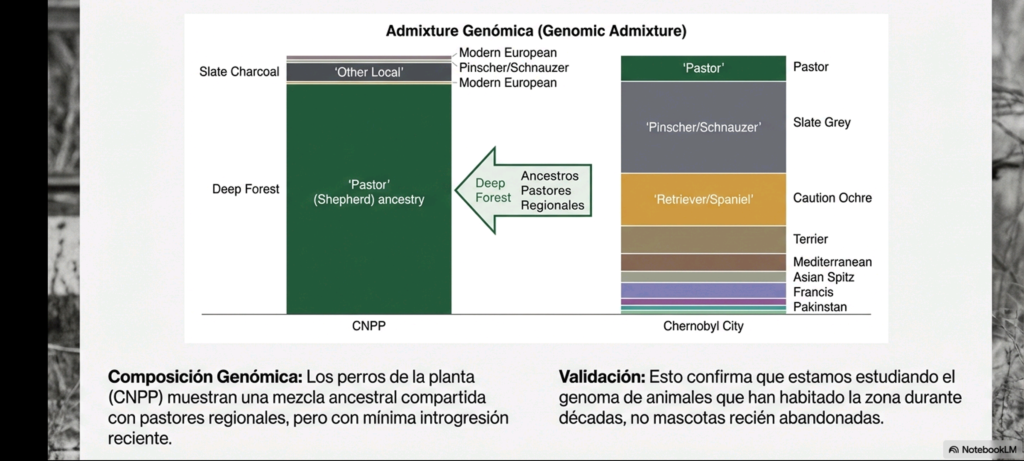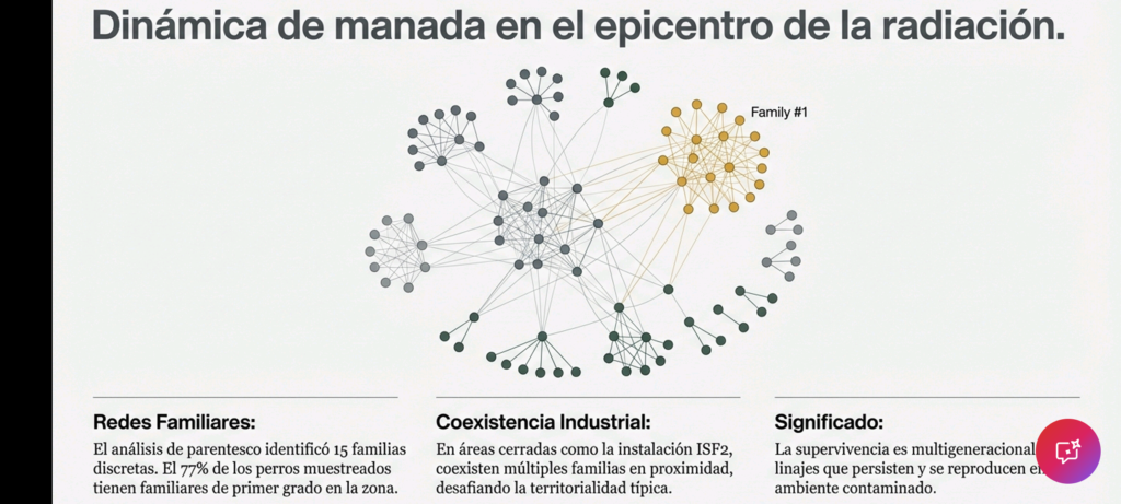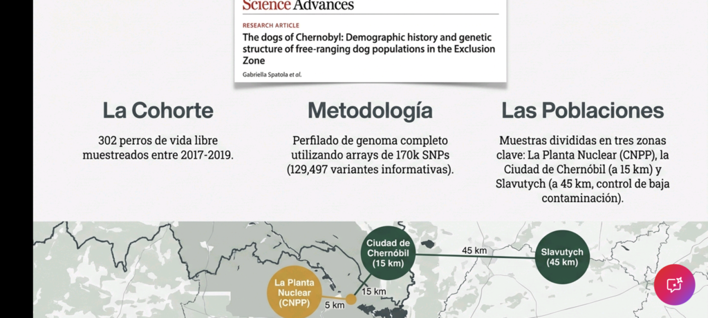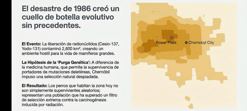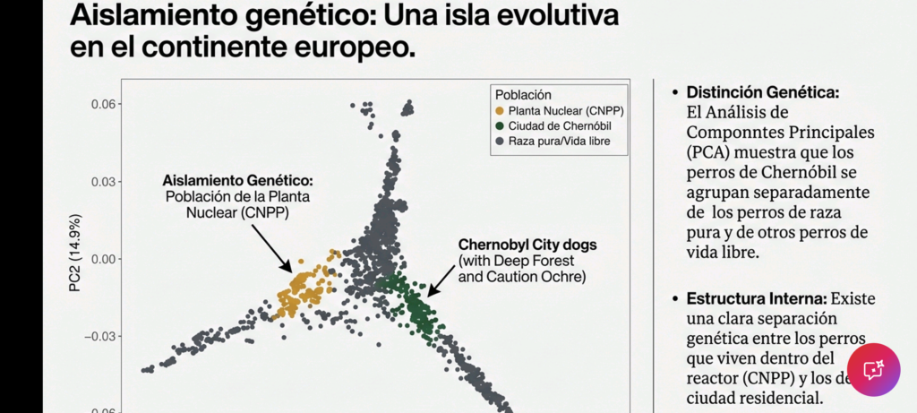 1. Caracterización de las Poblaciones en la Zona de ExclusiónEl estudio genómico identifica tres poblaciones principales distribuidas según la distancia al sitio del desastre, cada una con características genéticas divergentes:Estructura por UbicaciónPoblación Ubicación Nivel de Contaminación (Cs-137) Perfil GenéticoCentral Nuclear (CNPP) 0 km (Epicentro) Muy alto (10-400x superior a la ciudad) Aislamiento genético, menor diversidad, alta endogamia.Ciudad de Chernóbil 15 km Moderado Mayor diversidad (exogamia), influencia de razas modernas.Slavutych 45 km Bajo No es una población cerrada; predominio de mascotas y razas puras.Dinámica de Supervivencia e HistoriaTras la evacuación humana en 1986, el Ministerio de Asuntos Internos de Ucrania ordenó el sacrificio de mascotas abandonadas para evitar la propagación de contaminación. Sin embargo, algunos ejemplares sobrevivieron en la CNPP, siendo alimentados inicialmente por trabajadores de limpieza («liquidadores») y, más recientemente, por turistas. Los datos sugieren que las poblaciones actuales descienden de estos sobrevivientes originales, manteniendo una continuidad genética bajo exposición constante a radiación de dosis baja.