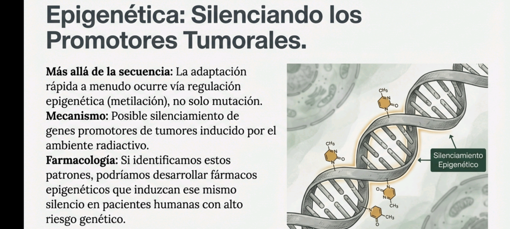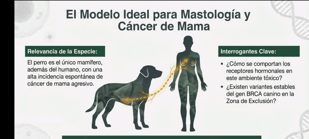 5. Relevancia Especial en MastologíaEl perro es el único mamífero, además del humano, con una alta incidencia espontánea de cáncer de mama agresivo. El estudio de los tejidos mamarios de las hembras en la CEZ es vital por las siguientes razones:* Regulación Hormonal: Investigar si poseen una regulación distinta de los receptores hormonales que les permite sobrevivir en ambientes carcinogénicos.* Epigenética: Si estos perros silencian promotores tumorales mediante metilación para sobrevivir, se podrían desarrollar fármacos epigenéticos para pacientes humanas de alto riesgo genético (portadoras de mutaciones en BRCA1/2).